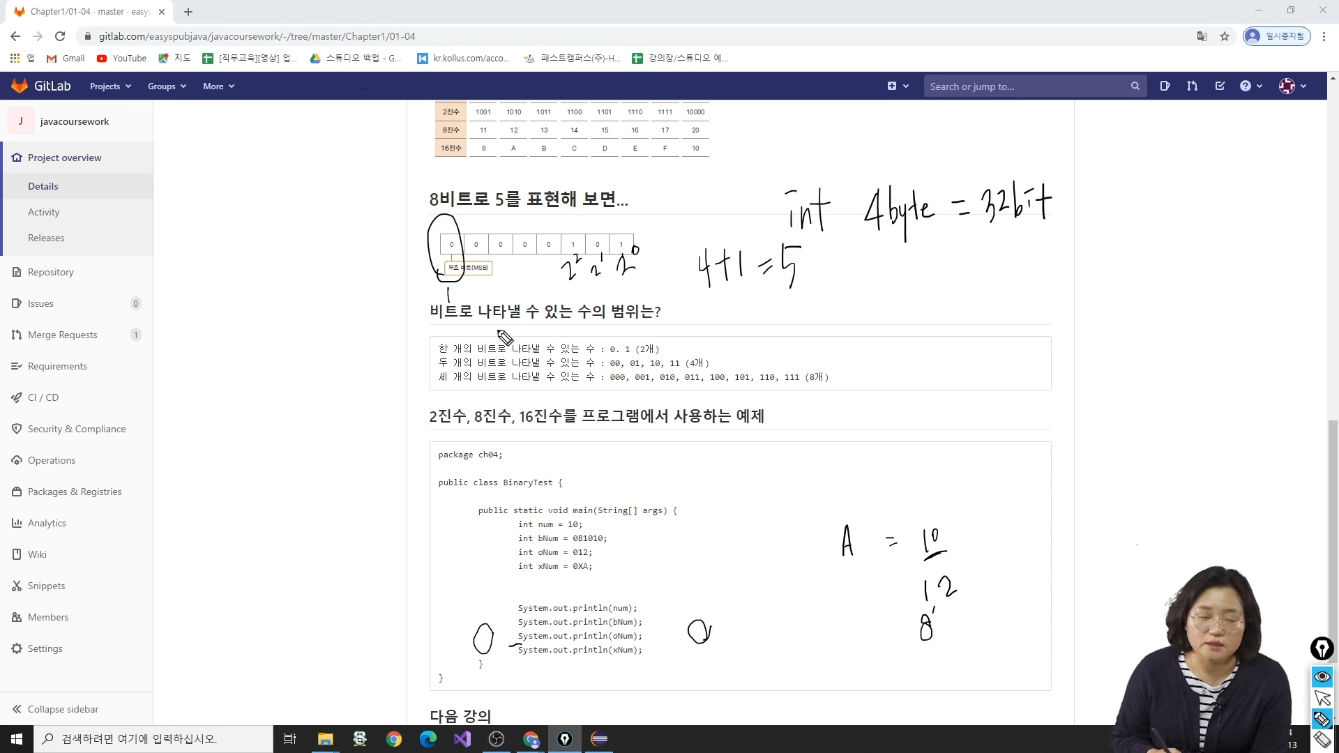 4강 - 컴퓨터의 메모리는 8비트로 구성되어 있다, 비트를 리터럴(*리터럴이라는 표현은 사용하지 않았음)로 어떻게 나타내느냐 같은 걸 설명해주셨는데 꽤나 호로록 하고 넘어가서 그런지 학교에서 배우는 것의 마이너 버전이라는 생각이 들더군요. (저야 학교 시험 때 프로그래밍 언어의 구성요소로 리터럴/키워드(예약어)/구분자(separator)... 같은 걸 외우기까지 했으니까요... 다 까먹었네요. 나머지로는 식별자(identifier)/연산자 가 있는 것 같습니다.)