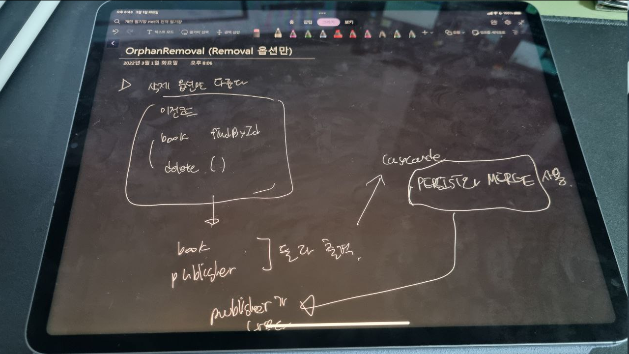 cascade 가 지정되는 어노테이션들 중 (강의에는 안 나오지만 확인해보니) @OneTo* 계열에는 orphanRemoval 이라는 속성이 있습니다. 별 건 아니고 해당 필드에 null 을 설정해서 관계가 지워진 채로 update가 될 때, 연결된 객체가 고아가 되면 같이 지워버릴지의 옵션입니다. cascade REMOVAL 이랑의 차이는 delete() 가 아니라 save() 로 저장되었을 때 일어난다는 점이겠네요.